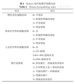 MOSLI等[20]认为Geboes分级标准和改良RILEY评分的有效性、反映性、临床相关性存在缺陷,在大规模的临床研究中不利于不同专家对同一疾病状态的评判和对患者药物治疗效果的评判,易造成临床决策的不一致,故其以Geboes分级标准为基础,于2017年建立了Robarts组织病理学指数(详见表6),并对其有效性、反映性、临床相关性进行了充分的验证。Robarts组织病理学指数将慢性炎性细胞浸润、固有层中性粒细胞浸润、上皮中性粒细胞浸润以及糜烂或溃疡划分为4个等级,并将各指标分级进行计算,其计算公式为:Robarts组织病理学指数=1×慢性炎性细胞浸润(4个等级)+2×固有层中性粒细胞浸润(4个等级)+3×上皮层中性粒细胞浸润(4个等级)+5×糜烂或溃疡(结合Geboes分级标准5.1和5.2后4个等级),总分范围从0(无疾病活动)到33(严重疾病活动)。Robarts组织病理学指数≤6定义为组织学缓解。