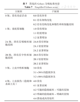 由于临床上用于评价UC疾病活动的评分系统在临床实践中的使用复杂,JAUREGUI-AMEZAGA等[22]于2017年在临床上最常使用的Geboes分级标准基础上进行了修改,开发了简化的Geboes分级标准(详见表7),其评价指标包括炎症活动情况、基底浆细胞、固有层嗜酸粒细胞、固有层中性粒细胞、上皮中性粒细胞、隐窝和表面上皮损伤等。