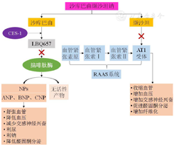 注:CES-1=羧酸酯酶1,LBQ657=沙库比利拉(一种活性的脑啡肽酶抑制剂),AT=血管紧张素,RAAS=肾素-血管紧张素-醛固酮系统,NPs=利钠肽系统,ANP=心房利钠肽,BNP=脑利钠肽,CNP=C型利钠肽