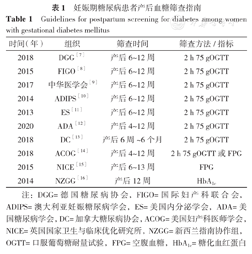 目前国内外很多组织发布了GDM患者产后血糖筛查相关指南,各指南对于筛查时间和筛查方法的建议不尽相同:国际妇产科联合会(FIGO)、德国糖尿病协会(DGG)、澳大利亚妊娠糖尿病学会(ADIPS)、美国内分泌学会(ES)、中华医学会、美国糖尿病学会(ADA)、加拿大糖尿病协会(DC)、美国妇产科医师学会(ACOG)均建议将2 h 75 g口服葡萄糖耐量试验(OGTT)作为产后血糖筛查方法,但筛查时间范围不同[7,8,9,10,11,12,13,14]。ADA的建议是产后4~12周,DC的建议是产后6周~6个月[11,12]。少数组织不建议将OGTT作为常规筛查方法。如英国国家卫生与临床优化研究所(NICE)建议在产后6~13周复查空腹血糖(FPG),新西兰指南协作组(NZGG)建议将糖化血红蛋白(HbA1c)作为产后血糖筛查指标[15,16](表1)。