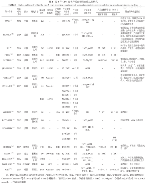 | TANG[27] | 2020 | 中国 | 横断面 | 465 | - | - | 152(32.7%) | 平均16.7个月 | 2 h75 gOGTT或FPG | - | - | 有稳定工作;曾接受GDM相关治疗;曾被医务人员告知产后应行血糖筛查 |