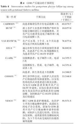 少数研究采取了较为综合性的策略。法国有4家医院在2011年联合开展了一项促进GDM患者产后血糖筛查的活动,名为"IMPACT",活动包括在每个医院举行多学科会议,向医护人员宣传产后血糖筛查的作用和重要性,同时以分发传单的形式对患者进行相关宣教,为每位GDM患者常规开具产后2 h 75 gOGTT申请单。为了改善产科和全科医生之间的合作,向患者的家庭医生发送信件以说明患者的GDM诊断、如何解读产后2 h 75 gOGTT结果以及后续建议。在这一系列努力之下,GDM患者在产后半年的血糖筛查率由33.3%提高到了48.9%[57]。VESCO等[58]基于系统的干预试验耗费了大量人力物力,但效果不尽人意。