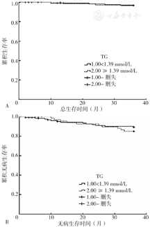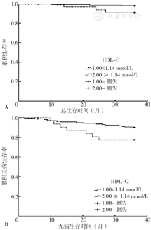 HDL-C≥1.14 mmol/L患者总生存率(98.1%)高于HDL-C <1.14 mmol/L患者(90.9%),差异有统计学意义(χ 2=4.669,P=0.031),见图1A。HDL-C<1.14 mmol/L患者无病生存率(77.4%)低于HDL-C≥1.14 mmol/L患者(89.8%),差异有统计学意义(χ2=3.859,P=0.049),见图1B。TG≥1.39 mmol/L和TG<1.39 mmol/L患者无病生存率(89.3%、85.1%)和总生存率(96.7%、97.1%)比较,差异无统计学意义(χ2=0.583,P=0.445;χ2=0.028,P=0.868),见图2A、2B。