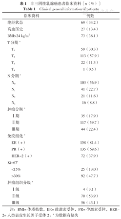 本研究为一项队列研究,已获得了中山大学孙逸仙纪念医院医学伦理委员会的批准(批号:SYSEC-KY-KS-2019-066)。2019年1月—2021年3月检索中山大学孙逸仙纪念医院2016年1月—2017年3月电子病历系统中非三阴性乳腺癌患者202例。纳入标准:(1)具备一般资料和检验数据、肿瘤病理及免疫组化结果;(2)无糖尿病、血脂异常、冠心病、脑血管疾病及相关药物使用史。排除标准:(1)三阴性乳腺癌及Ⅳ期乳腺癌患者;(2)取得病理结果前接受过辅助治疗;(3)肝肾功能异常者。