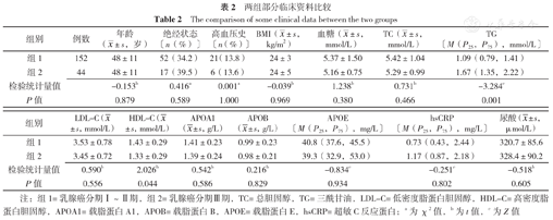 202例患者平均年龄为(48±11)岁,34.2%的患者为绝经状态,详见表1。组2 TG水平高于组1,而HDL-C水平低于组1,差异有统计学意义(P<0.05);两组年龄、绝经状态、高血压史、BMI、血糖、TC、LDL-C、APOA1、APOB、APOE、hsCRP、尿酸水平比较,差异无统计学意义(P>0.05),见表2。