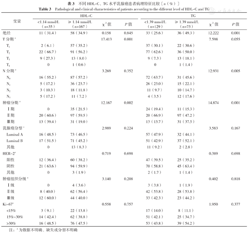 不同HDL-C、TG水平乳腺癌患者病理特征比较〔n(%)〕