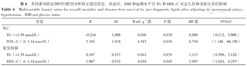 多因素风险比例回归模型分析矫正绝经状态、高血压、BMI和血糖水平后TG和HDL-C对总生存和无病生存的影响