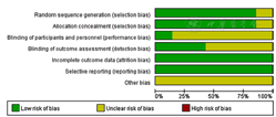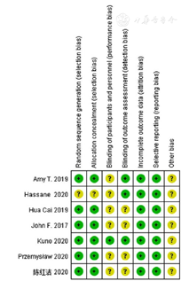 总体分析,文献均存在一定的偏倚风险,在随机分配方面:DOMASZEWSKI等[14]、陈红洁等[13]采用了随机分配方法,但未具体说明用哪种随机分配;CAI等[12]采用电脑随机数字表法;ZOUHAL等[15]并未说明是否采用随机分配方法;HOTTENROTT等[16]、HUTCHISON等[17]、TREPANOWSKI等[18]采用电视、报纸刊录的方式招募研究对象,并随机分配研究对象;其中HOTTENROTT等[16]文献质量最高,采用了组内双盲的方法,其他偏倚风险也较低,其余文献均未采用双盲;而试验结果的选择性报告和其他偏倚风险指标,由于其独特性,文献均未报告,但整体文献质量处于较高水平。文献的方法学质量见图2、图3。
