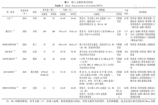 | DOMASZEWSKI[14] | 2020 | 波兰 | 25 | 20 | 65.0±4.0 | 66.0±4.7 | 摄入每日需要总能量,进食时间12:00~20:00,其余时间禁食 | 不限制饮食 | 6周 | 体质量/体质指数/无脂肪量 |