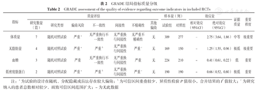 共纳入7篇RCT。Meta分析结果显示,试验组体质量、低密度脂蛋白(LDL)低于对照组〔均数差(MD)=-2.75,95%CI(-3.64,-1.86),P<0.000 01;MD=0.58,95%CI(0,1.16),P<0.000 1〕。试验组和对照组无脂肪量(FFM)、血糖比较,差异无统计学意义〔MD=-0.89,95%CI(-1.81,0.04),P=0.06;标准化均数差(SMD)=-0.56,95%CI(-1.40,0.28),P=0.19〕。运用GRADE工具对结局指标进行质量评价,结果显示,体质量为中等级,血糖为低等级,FFM和LDL为极低等级。