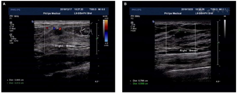 注:A为首次检出的良性乳腺结节,B为良性乳腺结节增长后