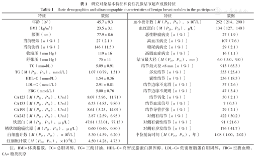 | CA153〔M(P25,P75),U/ml〕 | 6.53(4.85,9.80) | 结节血流信号〔n(%)〕 | 7(0.5) |