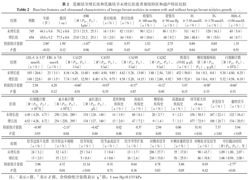乳腺结节增长组和乳腺结节未增长组患者基线特征和超声特征比较