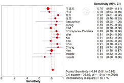 SROC平面散点图未呈明显"肩臂状",Spearman秩相关系数为0.193,P=0.474,提示各文献间不存在由阈值效应引起的异质性。所有结局指标I2>50%,故采用随机效应模型进行Meta分析。Meta分析结果显示,S-Detect鉴别诊断甲状腺结节良恶性的合并灵敏度、合并特异度、合并阳性似然比、合并阴性似然比、合并诊断比值比、AUC分别为0.84〔95%CI(0.81,0.86),P=0.003 6〕、0.71〔95%CI(0.69,0.73),P<0.000 1〕、3.31〔95%CI(2.45,4.47),P<0.000 1〕、0.22〔95%CI(0.17,0.29),P=0.000 6〕、15.93〔95%CI(9.85,25.78),P<0.000 1〕、0.89〔95%CI(0.84,0.94)〕。详见图2,图3,图4,图5,图6,图7。
