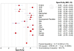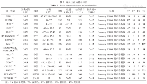由2名评价者根据文献纳入与排除标准独立筛选文献,确定最终纳入研究的文献。对于文献检索过程中出现的争议,由第3名评价者与前2名评价者共同分析,得出一致的结论。最终,提取和录入纳入文献的基本资料,包括第一作者、发表时间、国家、例数、年龄、性别、结节数目、探头频率、仪器、TP、FP、FN、TN。纳入研究的方法学质量评价采用QUADAS(Quality Assessment for Diagnostic Accuracy Studies)工具[6]。QUADAS工具共包括14项条目:每项条目以"是""否"或"不清楚"进行评价。以上过程均由2名评价者按照标准独立进行。
