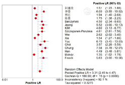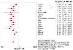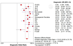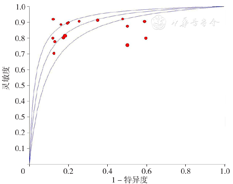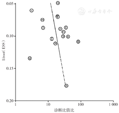采用Meta-Disc 1.4和Stata 15软件进行统计学分析。通过绘制集成受试者工作特征(SROC)曲线观察图形是否为"肩臂状",再通过计算Spearman秩相关系数判断是否存在阈值效应。通过I2判断研究的异质性大小,I2<50%且P>0.1时采用固定效应模型进行分析,否则采用随机效应模型。统计指标为合并灵敏度、合并特异度、合并阳性似然比、合并阴性似然比、合并诊断比值比和受试者工作特征(ROC)曲线下面积(AUC);检验水准α=0.05。采用"逐一排除法"进行敏感性分析;绘制Deek漏斗图判断发表偏倚,P<0.10时表明存在发表偏倚。