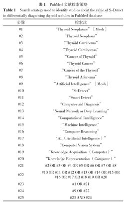 计算机检索PubMed、EMBase、Web of Science、the Cochrane Library、万方数据知识服务平台、中国知网、维普网和中国生物医学文献服务系统,检索时限为建库至2021-01-06。中文检索词包括:甲状腺、S-Detect、计算机辅助诊断。本研究搜索了相关主要出版物中的参考文献,以确定其他符合条件的研究,并对最终被纳入的研究所包含的参考文献进行了审查,扩大了搜索范围,以确定其他潜在的相关研究。英文检索词包括S-Detect,thyroid,computer aided diagnosis,Artificial Intelligence等。以PubMed为例,其文献检索策略见表1。