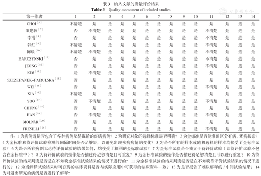 注:1为病例谱是否包含了各种病例及易混淆的疾病病例?2为研究对象的选择标准是否明确?3为金标准是否能准确区分有病、无病状态?4为金标准和待评价试验检测的间隔时间是否足够短,以避免出现疾病病情的变化?5为是否所有的样本或随机选择的样本均接受了金标准试验?6为是否所有病例无论待评价试验的结果如何,均接受了相同的金标准试验?7为金标准试验是否独立于待评价试验(即待评价试验不包含在金标准中)?8为待评价试验的操作是否描述得足够清楚且可重复?9为金标准试验的操作是否描述得足够清楚且可以进行重复?10为待评价试验的结果判读是否是在不知晓金标准试验结果的情况下进行的?11为金标准试验的结果判读是否是在不知晓待评价试验结果的情况下进行的?12为当解释试验结果时可获得的临床资料是否与实际应用中可获得的临床资料一致?13为是否报告了难以解释的/中间试验结果?14为对退出研究的病例是否进行了解释?