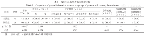 | 组别 | 例数 | 年龄 ( ±s,岁) | 性别〔n(%)〕 | 文化程度〔n(%)〕 | 合并疾病 〔n(%)〕 | 行冠状动脉支架植入术 〔n(%)〕 | 行冠状动脉旁路移植术 〔n(%)〕 | ||||