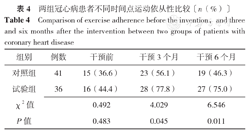 Comparison of exercise adherence before the invention,and three and six months after the intervention between two groups of patients with coronary heart disease