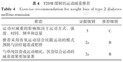 运动是控制体质量的最佳手段之一。运动是T2DM治疗的基础,糖尿病患者通过运动可以直接消耗部分能量而达到控制血糖的目的。运动也可以增加肌肉的容积并使胰岛素敏感性得到持续性改善。此外,运动还可以改善患者血脂、血压和心血管健康,提高其愉悦感。
