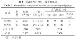入组的患者组中有1例脱落(认知评估过程中出现情绪激动等暴力行为),最终成功入组74例首发精神分裂症患者;招募的健康对照组中有2例脱落(采血过程中出现不适),最终成功招募了73例健康受试者。两组性别、年龄、文化程度比较,差异均无统计学意义(P>0.05),见表2。