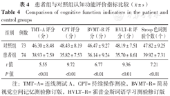 患者组TMT-A评分、CPT评分、BVMT-R评分、HVLT-R评分、Stroop色词测验个数均低于对照组,差异有统计学意义(P<0.01),见表4。