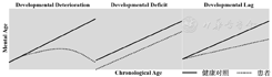 近年来研究提示,SZ患者的认知功能损害可能出现在更早期,如儿童期[8]。Meta分析显示,很多成年后被诊断为SZ的患者儿童期智商低于同龄人,其智商每降低1分,SZ患病风险将增加3.7%[10,11]。关于SZ发病前认知功能发展过程存在发育恶化、发育缺陷以及发育滞后3种假说,如图1所示[12]。为了验证这3种假说,REICHENBERG等[12]对1 037例刚出生人群进行了为期30年的随访研究,在队列成员7、9、11、13岁时测量其认知功能,最终症状随访年龄为32岁,结果显示后来发展为SZ的35例患者在测量点认知表现均差于健康组,首先在语言和视觉知识获取、推理和概念化方面呈发育缺陷状态,随后在处理速度、注意力、视觉空间问题解决能力和工作记忆等方面呈发育滞后状态。最近MOLLON等[13]在时间上(个体出生后18个月~20岁)扩展了以上研究并得出类似研究结果,两组研究均未验证认知功能发育恶化假说,表明SZ患者发病前认知功能缺陷并非随时间推移而发生功能的绝对退化,而是个体无法跟上正常的发育速度,并指出初始缺陷与随后的滞后表现具有强相关性,说明青春期出现的认知功能损害在童年早期就开始了。
