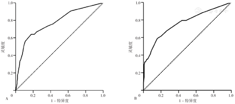 基于回退法多因素Logistic回归分析的回归系数对PUB患者住院时间延长的各个独立危险因素进行赋分,见表3。预测评分模型总分为0~8.02分,总分越高则住院时间延长的风险越高(图1)。训练集和测试集的预测评分模型预测PUB患者住院时间延长的ROC曲线见图2,预测评分模型在训练集中的AUC为0.77〔95%CI(0.71,0.84)〕,在测试集中的AUC为0.76〔95%CI(0.66,0.86)〕。训练集和测试集的最佳界值均为2.45分。在训练集中,当预测评分≥2.45分时,共有92例患者被预测为超长住院,其灵敏度为64.00%,特异度为82.25%,阳性预测值为52.17%,阴性预测值为88.31%。在测试集中,当预测评分≥2.45分时,共有40例患者被预测为超长住院,其灵敏度为58.82%,特异度为84.38%,阳性预测值为50.00%,阴性预测值为88.52%。