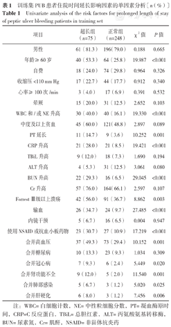 训练集中超长组和正常组男性比例及自费、收缩压<110 mm Hg、心率≥100次/min、晕厥、中度及以上贫血、TbiL升高、ALT升高、Cr升高、内镜干预、合并糖尿病者所占比例比较,差异均无统计学意义(P>0.05);超长组年龄≥60岁、WBC和/或NE升高、PT延长、CRP升高、BUN升高、Forrest Ⅲ级以上溃疡、输血、使用非甾体抗炎药(NSAID)或抗血小板药物、合并高血压、合并冠心病、合并肾功能不全、合并肺部感染、合并肝硬化者所占比例均高于正常组,差异有统计学意义(P<0.05),见表1。