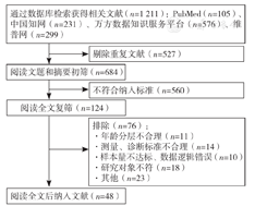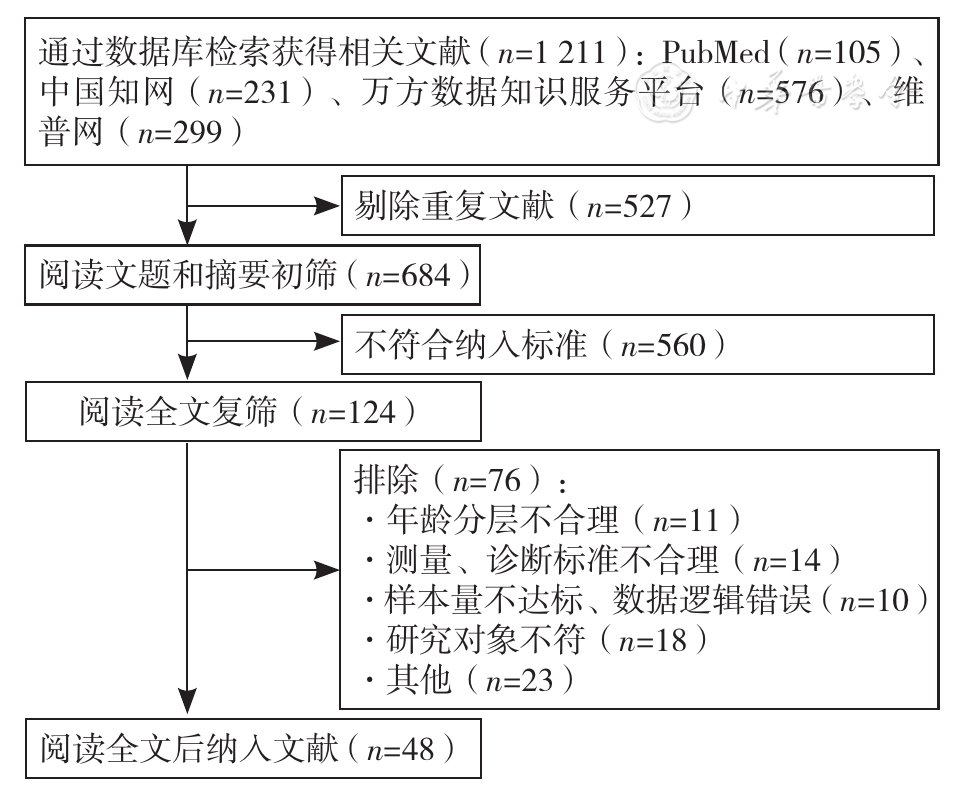 初检共获得相关文献1 211篇,经逐层筛选后,最终纳入48篇横断面研究[4,5,6,7,8,10,11,12,13,15,16,17,18,19,20,21,22,23,24,25,26,27,28,29,30,31,32,33,34,35,36,37,38,39,40,41,42,43,44,45,46,47,48,49,50,51,52,53],共包含68 932例研究对象。文献筛选流程及结果见图1。
