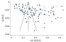 根据中国≥60岁老年人OP患病率绘制漏斗图,结果显示,各研究点左右分布对称性欠佳,但Egger's和Begg's检验P值分别为0.052和0.207,提示存在发表偏倚的可能性较小(图2)。