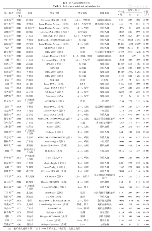 | 区品中[49] | 2002 | 广东省 | Lunar DPX-L | L2~4、髋部 | 随机整群抽样 | 1 160 | 300 | 300 | ≥60 |