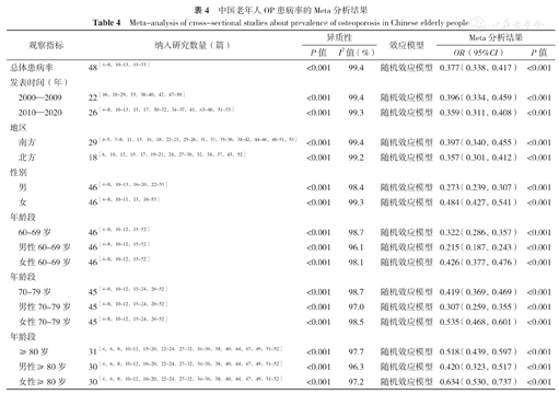 Meta分析结果显示,中国60~69岁老年人OP患病率为32.2%〔95%CI(28.6%,35.7%)〕,70~79岁老年人OP患病率为41.9%〔95%CI(36.9%,46.9%)〕,≥80岁老年人OP患病率为51.8%〔95%CI(43.9%,59.7%)〕(表4)。
