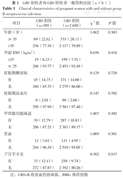 | 项目 | GBS阳性(n=305) | GBS阴性(n=2 650) | χ2值 | P值 | |