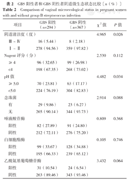 | 项目 | GBS阳性(n=294) | GBS阴性(n=367) | χ2值 | P值 | |