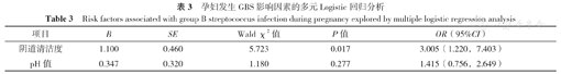 以GBS为因变量(赋值:阳性=1,阴性=0),以阴道清洁度(赋值:Ⅲ~Ⅳ度=1,Ⅰ~Ⅱ度=0)、pH值(赋值:≥5.0=1,<5.0=0)为自变量进行多元Logistic回归分析,结果显示,阴道清洁度Ⅲ~Ⅳ度是孕妇发生GBS的危险因素(P<0.05),见表3。
