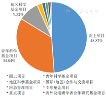 | 年份 | 面上项目 | 青年科学基金项目 | 地区科学基金项目 | 国际(地区)合作与交流项目 | 应急管理项目 | 专项基金项目 | 重点项目 | 海外及港澳学者合作研究基金项目 | 合计 |