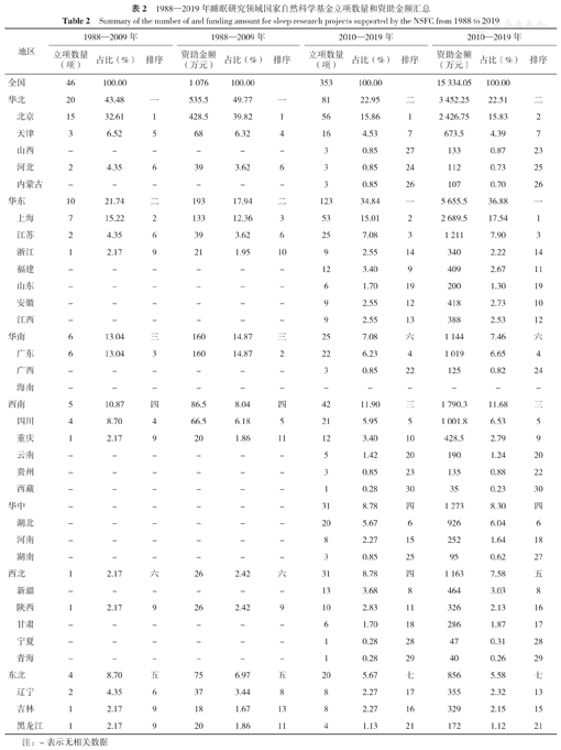 随着社会经济的发展和对睡眠障碍认识的不断深入,我国在睡眠研究领域不断突破。研究可见国家自然科学基金立项数量从1988年的1项增加到2019年的51项,资助金额从1988年的1.5万元增加到2019年的1 987万元,均有了巨大飞跃;项目类型逐渐丰富,每年立项从最初的只有面上项目增加为最多7种项目类型;立项项目的依托单位显著扩大,依托单位数从1988—2009年的27个增加至2010—2019年的94个;立项项目的省域分布极大地扩展,从1988—2009年的13个省(市、自治区)增加至2010—2019年的30个。以上说明国家对于睡眠研究领域的投入和支持力度明显加大,整体科研水平显著提高,特别是2009年9月国家自然科学基金委医学科学部成立,加强了战略引导,加大了健康领域资助力度[5],专门设立"睡眠呼吸障碍"(代码为H0113)和"睡眠与睡眠障碍"(代码为H0916)资助睡眠研究。从2010年开始睡眠医学领域立项数量与资助金额增加明显,并且立项了重点项目支持睡眠医学领域已有较好基础的研究方向或学科生长点开展深入、系统的创新性研究[6],极大地促进了睡眠研究的发展。