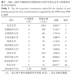 1988—2009年睡眠研究领域国家自然科学基金竞争力指数排序前10位的单位