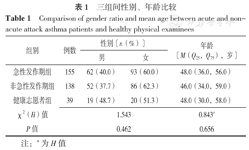 Comparison of gender ratio and mean age between acute and non-acute attack asthma patients and healthy physical examinees