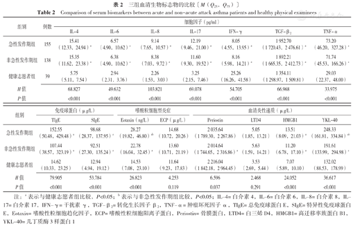 急性发作期组、非急性发作期组血清IL-4、IL-6、IL-8、IL-17、TGF-β2、TNF-α、HMGB1、TIgE、SIgE水平均高于健康志愿者组(P<0.05);急性发作期组、非急性发作期组血清IFN-γ水平低于健康志愿者组(P<0.05);急性发作期组血清Eotaxin、YKL-40水平高于非急性发作期组和健康志愿者组,非急性发作期组Eotaxin、YKL-40水平高于健康志愿者组(P<0.05);非急性发作期组Periostin水平低于健康志愿者组(P<0.05)。