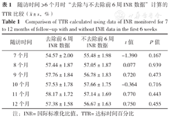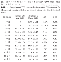 随访时间>6个月:随访7、8、9、10、11、12个月去除与不去除前6周INR数据计算的TTR比较,差异均无统计学意义(P>0.05),见表1。随访时间为12个月:当TTR计算时间基线设置为12个月且去除前6周INR数据时,随访第1个月与第2个月时的TTR无法按设定的公式进行计算,视TTR为0;随访1、2个月去除与不去除前6周INR数据计算的TTR比较,差异有统计学意义(P<0.001);随访3、4、5、6、7、8、9、10、11、12个月去除与不去除前6周INR数据计算的TTR比较,差异均无统计学意义(P>0.05),见表2。