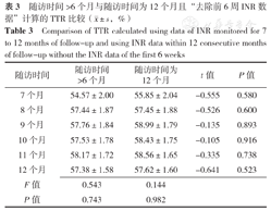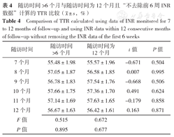 去除前6周INR数据:随访时间>6个月与随访时间为12个月时随访7~12个月TTR比较,差异均无统计学意义(P>0.05),见表3。不去除前6周INR数据:随访时间>6个月与随访时间为12个月时随访7~12个月TTR比较,差异均无统计学意义(P>0.05),见表4。随访7~12个月随访时间>6个月且去除前6周INR数据、随访时间为12个月且去除前6周INR数据、随访时间>6个月且不去除前6周INR数据、随访时间为12个月且不去除前6周INR数据计算的TTR比较,差异均无统计学意义(P>0.05),见表3,表4。