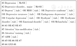 计算机检索PubMed、The Cochrane Library、EMBase、中国生物医学文献数据库(CBM)、中国知网(CNKI)、万方数据知识服务平台和维普网(VIP),搜集关于ABM治疗抑郁的RCT,检索年限为建库至2021-12-31。中文检索词:抑郁、忧郁、注意偏向训练、注意偏向矫正等;英文检索词:Depression、Depressive disorder、major、Depress*、MDD、Depressive syndrome*、Depressive neuroses、Endogenous depression*、Unipolar depression*、Dysthymi*、Dysthymic disorder、Emotional disorder*、Melancholia*、Attention* bias modification、Attention* training、ABM等,同时追溯相关文献的参考文献来补充获取文献。以PubMed为例,文献检索策略见图1。