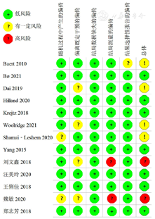 13篇文献[8,9,12,17,18,19,20,21,22,23,24,25,26]均为RCT,根据Cochrane偏倚风险评估标准,其中7篇文献[9,12,18,19,23,24,26]评价为低偏倚风险,4篇文献[8,17,20,21]评价为中偏倚风险,2篇文献[22,25]评价为高偏倚风险,见表1,图3,图4。