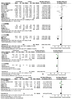 13篇文献[8,9,12,17,18,19,20,21,22,23,24,25,26]分别采用BDI-Ⅱ、HAMD、CES-D评价了ABM对患者抑郁情绪的影响,共纳入患者968例,其中试验组485例,对照组483例。由于研究测量工具不一致,采用SMD将研究结果进行合并。各研究间异质性较大(I2=91%),采用随机效应模型进行Meta分析,结果显示,试验组与对照组抑郁评分比较,差异有统计学意义〔SMD=-0.58,95%CI(-1.04,-0.11),P=0.01〕。8篇文献[9,17,18,20,21,23,24,26]采用BDI-Ⅱ量表评估,各研究间存在较大异质性(I2=87%),故采用随机效应模型进行Meta分析,结果显示,试验组与对照组BDI-Ⅱ评分比较,差异无统计学意义〔SMD=-0.30,95%CI(-0.86,0.26),P>0.05〕。3篇文献[8,12,22]报道了HAMD评分,研究间异质性较大(I2 =56%),故采用随机效应模型进行Meta分析,结果显示,试验组与对照组HAMD评分比较,差异无统计学意义〔SMD=-0.30,95%CI(-0.71,0.12),P>0.05〕。2篇文献[19,25]报道了CES-D评分,研究间不存在异质性(I2=0%)但因部分亚组内具有统计学异质性,故采用随机效应模型进行Meta分析,结果显示,试验组与对照组CES-D评分比较,差异有统计学意义〔SMD=-2.16,95%CI(-2.61,-1.72),P<0.000 01〕,见图5A。