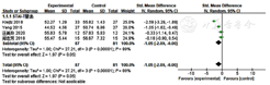 5篇文献[8,9,19,23,26]分别采用STAI-T、BAI量表评价了ABM对抑郁患者焦虑评分的影响,共纳入患者200例,其中试验组103例,对照组97例。由于研究测量工具不一致,故采用SMD将研究结果进行合并。各研究间异质性较大(I2=65%),采用随机效应模型进行Meta分析,结果显示,试验组与对照组焦虑评分比较,差异有统计学意义〔SMD=-2.70,95%CI(-4.86,-0.54),P=0.01〕。4篇文献[9,19,23,26]报道了STAI-T评分,共纳入患者168例,其中试验组87例,对照组81例;各研究间异质性较大(I2=89%),采用随机效应模型进行Meta分析,结果显示,试验组与对照组STAT-T评分比较,差异无统计学意义〔SMD=-1.05,95%CI(-2.09,-0.00),P=0.05〕。见图6。