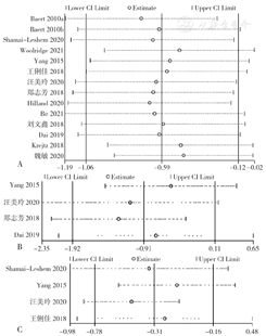 通过逐一剔除纳入研究进行敏感性分析,在逐一剔除过程中总体效应值未发生明显变化,提示由单个研究引起的偏倚较小,Meta分析结果较为稳健(图9)。