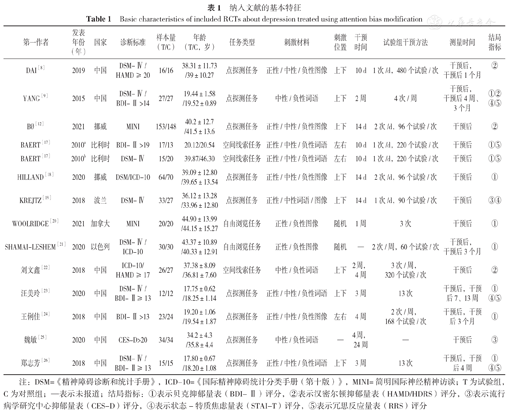 | YANG[9] | 2015 | 中国 | DSM-Ⅳ/BDI-Ⅱ>14 | 27/27 | 19.44±1.58/19.52±0.89 | 点探测任务 | 中性/负性词语 | 上下 | 2周 | 4次/周 | 干预后,干预后4周、3个月 | ①②④⑤ |